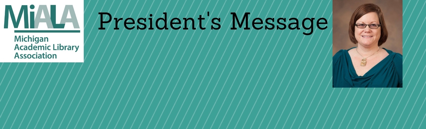 It’s November and we are in the height of fall colors. This time of year is my favorite and with Thanksgiving approaching it is a time of gratitude and thankfulness. There is so much I am grateful for with MiALA and you, its members. I want to thank you for your leadership and dedication to MiALA. I also want to thank our Institutional Members who give us many opportunities to continue our mission. Thank you. I’d like to thank our membership committee who is sponsoring a mentoring program through MiALA. Mentoring newer librarians is a valuable exercise to acclimate them to our profession and guide them on their new career path. If you wish to be a mentor or a mentee please find the sign-up on our website. Applications are due November 8, 2019. I am also wanting to thank all of our IG members. They have been busy hosting meetings and planning small events. It is this activity that keeps our organization moving forward. Thank you. Lastly, I wish to thank the leadership of MiALA, our board members, committee members, IGCC members and IG chairs. Your leadership is appreciated as is your hard work and dedication to MiALA. You are the glue that keeps the organization together. Thank you. Thank you all for being apart of MiALA and finding value within our organization. Respectfully yours, Beth Martin MiALA President