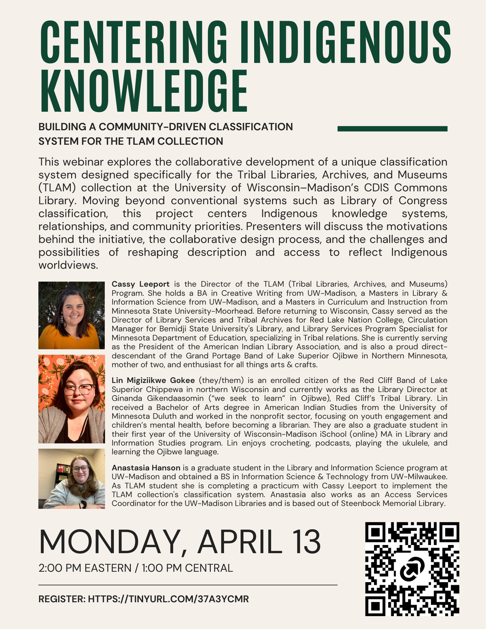 Centering Indigenous Knowledge: Building a Community-Driven Classification System for the TLAM Collection. Please join us for a webinar with Cassy Leeport, Lin Migiziikwe Gokee, and Anastasia Hanson. This webinar explores the collaborative development of a unique classification system designed specifically for the Tribal Libraries, Archives, and Museums (TLAM) collection at the University of Wisconsin–Madison's CDIS Commons Library. Moving beyond conventional systems such as Library of Congress classification, this project centers Indigenous knowledge systems, relationships, and community priorities. Presenters will discuss the motivations behind the initiative, the collaborative design process, and the challenges and possibilities of reshaping description and access to reflect Indigenous worldviews.
