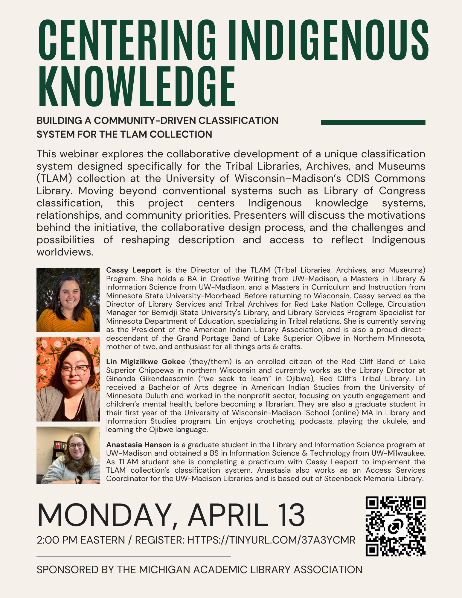 Please join us for a webinar with Cassy Leeport, Lin Migiziikwe Gokee, and Anastasia Hanson. This webinar explores the collaborative development of a unique classification system designed specifically for the Tribal Libraries, Archives, and Museums (TLAM) collection at the University of Wisconsin–Madison’s CDIS Commons Library. Moving beyond conventional systems such as Library of Congress classification, this project centers Indigenous knowledge systems, relationships, and community priorities. Presenters will discuss the motivations behind the initiative, the collaborative design process, and the challenges and possibilities of reshaping description and access to reflect Indigenous worldviews.